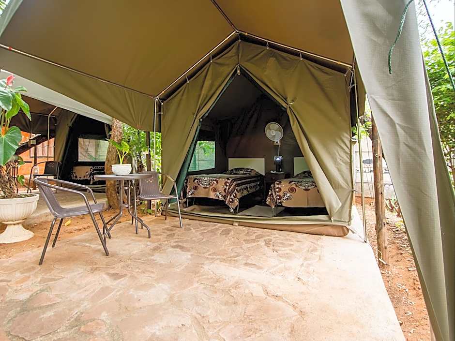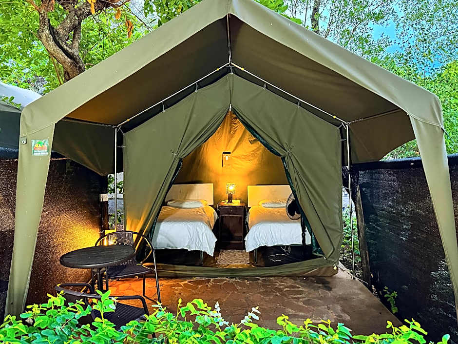 The tent includes a shared bathroom equipped with a shower. The unit offers 2 beds.